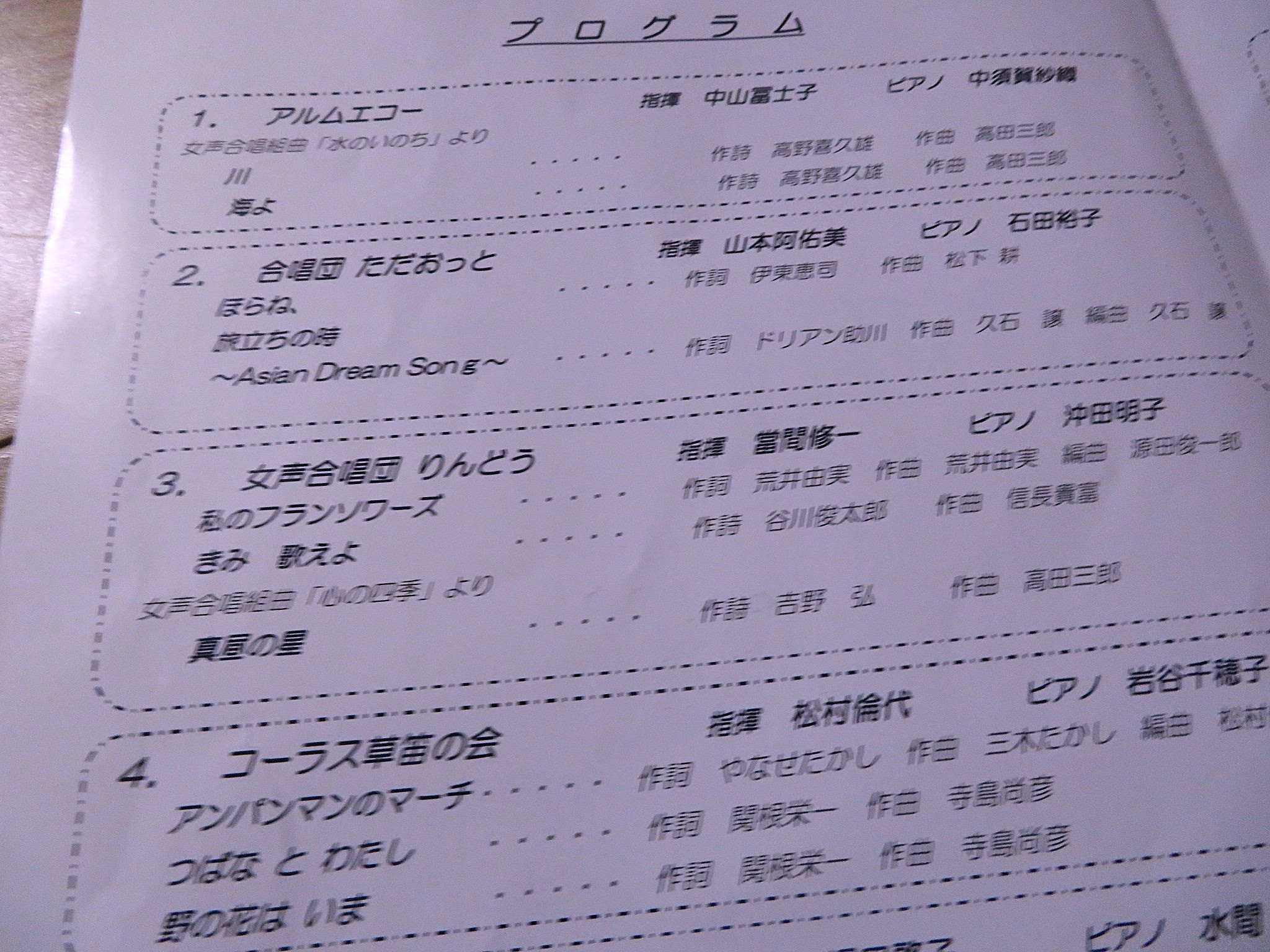 5月30日(金)第18回団内コンサートが川西市アステ市民プラザマルチスペース2にて開催されました。 団内コンサートは、ほぼ二年に一度開催されており、りんどうのメンバーがお互いの歌を聴き合います。外に向けて発信するのではなく、内に向けて発信する、仲間意識が高まる良い機会です。一人一人が数か月前から曲選びをし、りんどうの練習とは別に密かに(?)練習を重ねて、発表の日を迎えます。 前半と後半の2部構成で、前もって歌う順番をくじ引きで決めて、また伴奏者の沖田先生と江戸さんに順番に伴奏してもらえるように、色々と練られたようです。 一部は、安藤さん→眞田さん→汐巻さん→(アンサンブル)「こりんどう」→谷川さん→山口さん→佐藤→(アンサンブル)「ソプラノ下」→高橋さん(初)→坂田さん 休憩を挟んで、二部は、今村さん→山川さん→神谷さん→(アンサンブル)「昼・コリン(どう)ズ」→田中さん(初)→島田さん→北山さん |