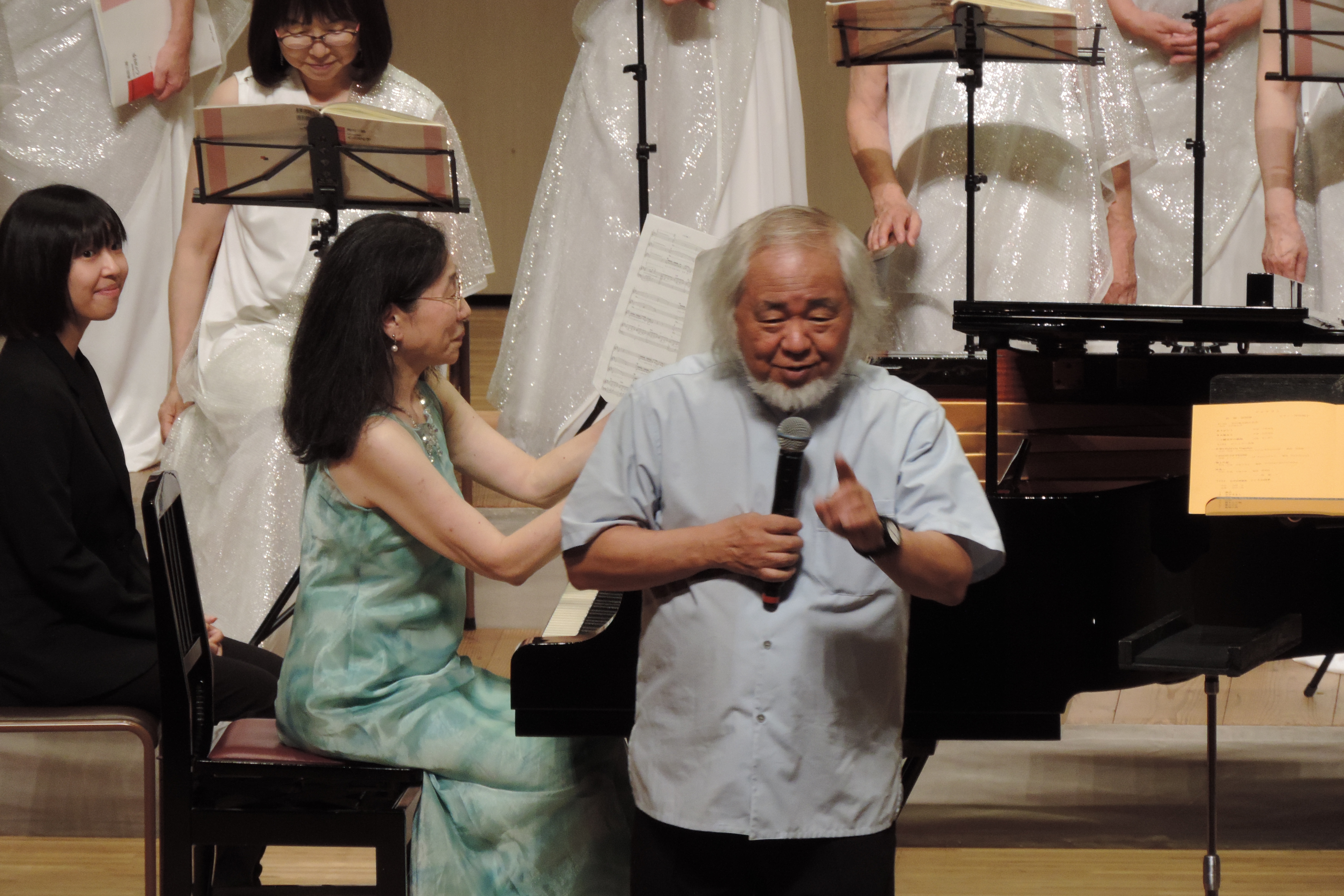 | 猛暑が続く中、8月30日、31日に強化練習をしました。 當間先生に聴いて頂くのはポピュラーステージの曲を決めた6月以来ですので、もうドキドキです。ポピュラー曲、谷川俊太郎詩の曲「ありがとう」「きみ歌えよ」「二十億光年の孤独」そして「心の四季」と演奏会に決まった曲は全部通しました。 心配していたより良かったじゃないですかと言って下さってちょっと安心したものの、さて皆さんはこれからどうすればいいと思いますか?と先生からの問いかけがありました。 一体感を感じたい、それにはどうしたらいいか・・・。 先生から「ピッチが揃えばハーモニーも整い一体感が生まれる。合唱におけるハーモニーは最高のものでこれを求めましょう。聴きあって自分の声がハーモニーの一部になるように。」と。 (アルト: 神谷恵美子 記) |